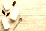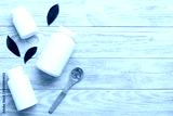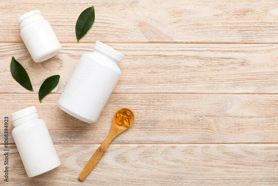 Omega-3 capsules lie in white bottle on a table with green leaves background. Fish oil tablets. Biologically active additives. omega 6, omega 9, vitamin A, E, D, vitamin D3 top view with copy space