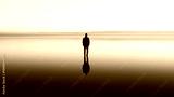 Silhouette of man standing alone on a lake with reflection in the water. Minimalist black and white photo, solitude, reflection