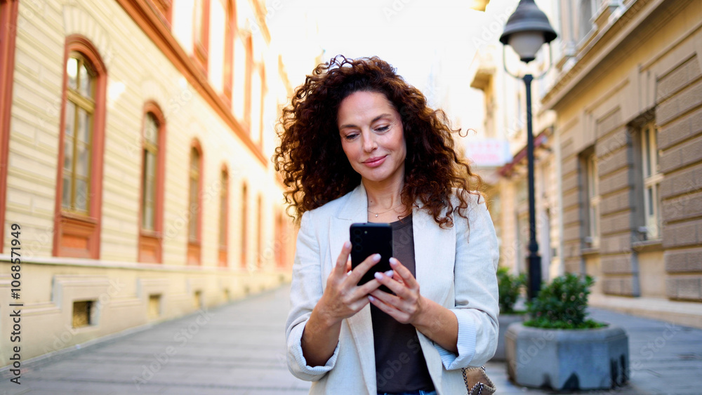 Beautiful, mid adult woman walking through the city, using smartphone and enjoying