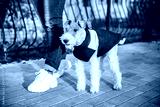 Dog wire fox terrier wearing warm puffer vest coat for cold weather on on leash walking on street outdoor. Pet jacket quilted vest clothes.