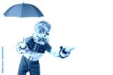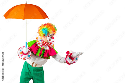 Surprised clown holding umbrella. Entertainer Joker in colorful suit and wig. Buffoon with clown whiteface makeup. Professional actor at event, kid's party, circus