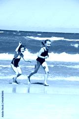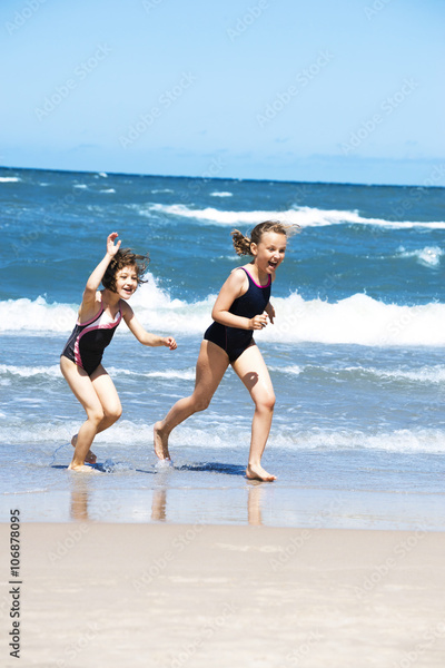Two Girls Running Along Beach Smiling and Splashing Water.