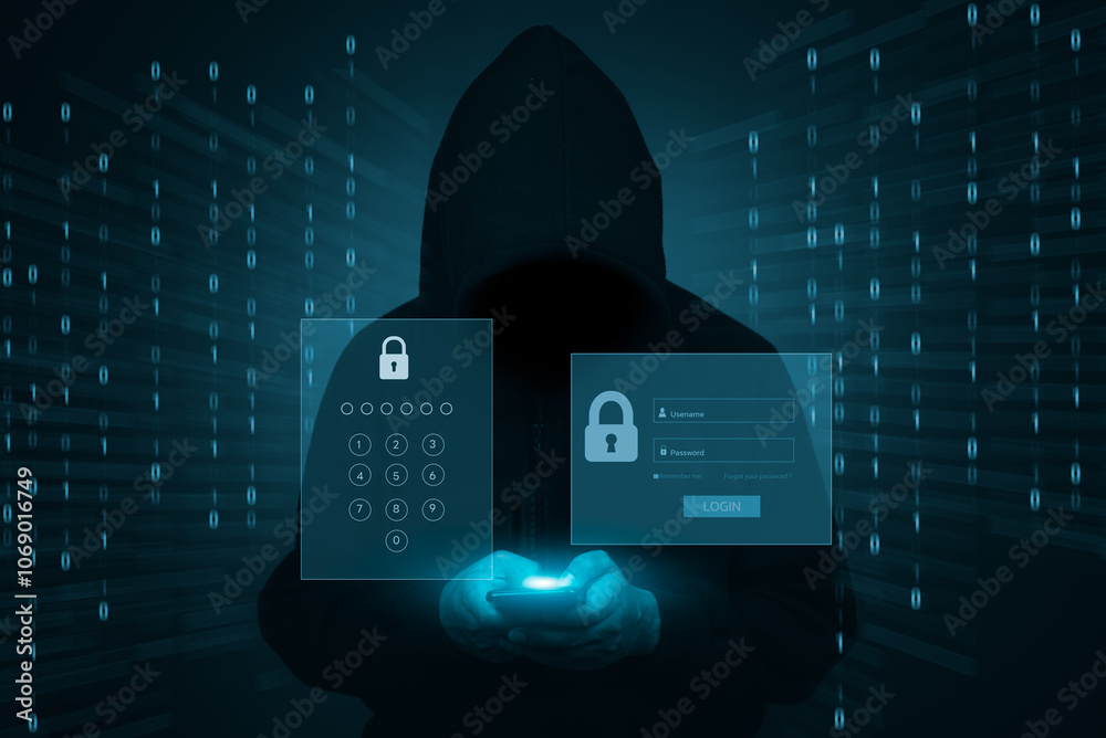 Anonymous person in hoodie using phone, representing cybersecurity threats or hacking attempts. Great for security, IT, and data protection visuals.