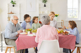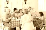 Happy family gathering union meal at home, grandparents, mother, father with two small children in living room enjoying weekend, smiling parents enjoying leisure time, holiday common dinner together
