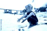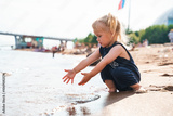Little child girl on the City shore on the sea with a beach. Saint Petersburg, Russia - 26 July 2024