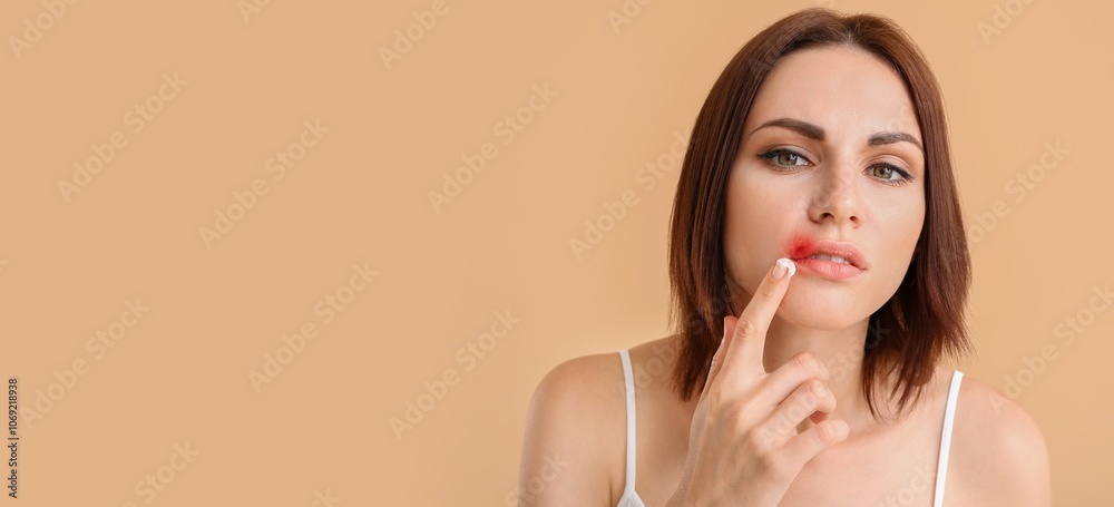 Young woman with cold sore applying ointment on her lips against beige background with space for text