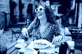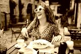 Woman eating italian pasta and drinking coffee at restaurant on the street in Rome. Concept of Italian gastronomy and travel.