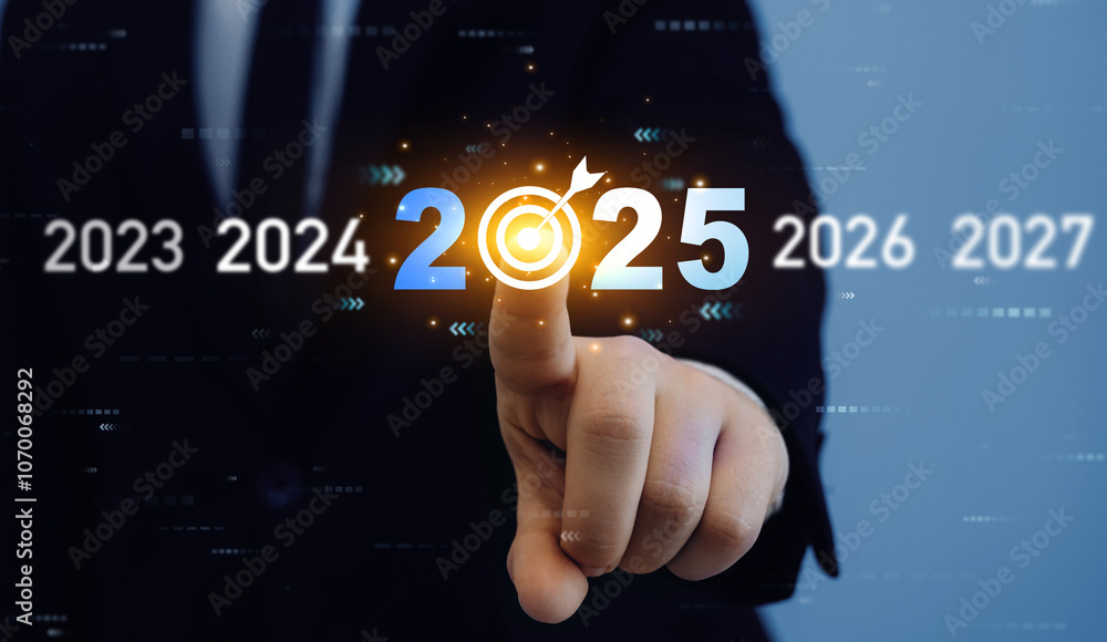 Businessman touching growth chart from success year 2025.Business plan in company 2025.Development to business success and achievement in 2025 year.New plans,aim,goals and visions in business.