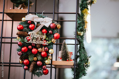 Beautiful festive decorations on the Christmas tree. Close-up. Beautiful Christmas background. The concept of decorations and decor for the new year.