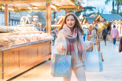Happy woman enjoys shopping at festive Christmas market while carrying shopping paper bags, walking in street Xmas fair of European city. Selecting gifts for New Year, winter holiday sales, discounts.