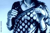 Dressed in beautiful saree, Indian woman delicately putting traditional jewellery necklace getting ready for ethnic festive celebration. Indian culture, ritual holiday in modern life. Selective focus.