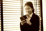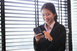 Young Asian businesswoman in suit using smartphone in office, space for creating text.