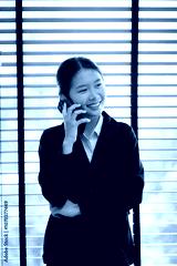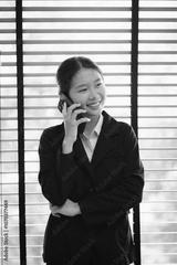 Young Asian businesswoman in suit using smartphone in office, space for creating text.