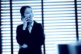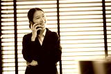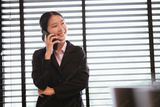 Young Asian businesswoman in suit using smartphone in office, space for creating text.