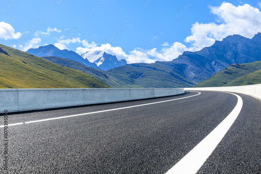 Countryside asphalt road and green meadow with mountains nature landscape on a sunny day. Road trip.