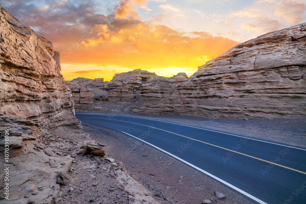 Asphalt road and Yardang landform mountain natural landscape at sunrise. road trip.