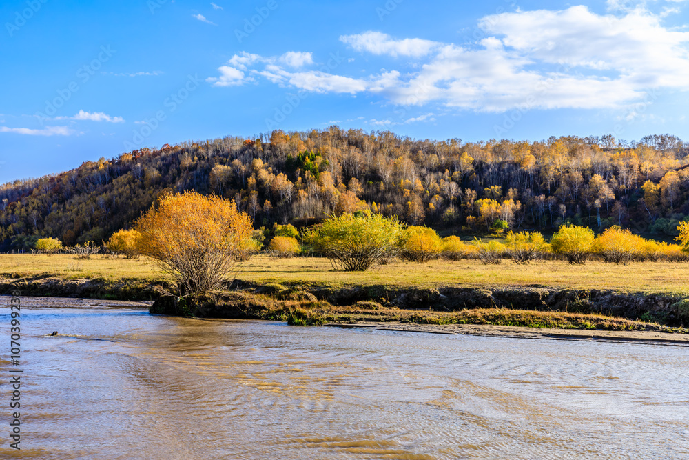 Flowing river and yellow grassland with forest natural landscape in autumn. Beautiful grassland pasture natural scenery in Inner Mongolia, China.