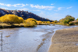 Flowing river and yellow forest with mountain natural landscape in autumn. Beautiful natural park scenery in Inner Mongolia, China.
