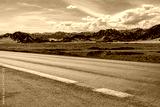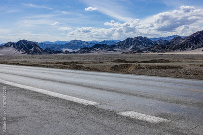 Asphalt highway road and mountain nature landscape under blue sky. Road trip.