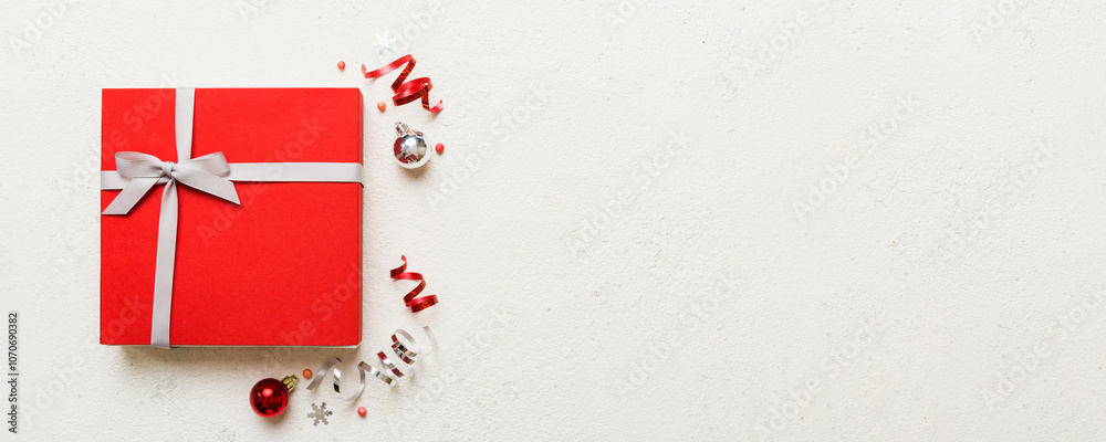 Top view Flat lay Christmas decorations and gift box on colored background with copy space. Christmas or Happy New Year composition