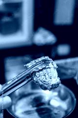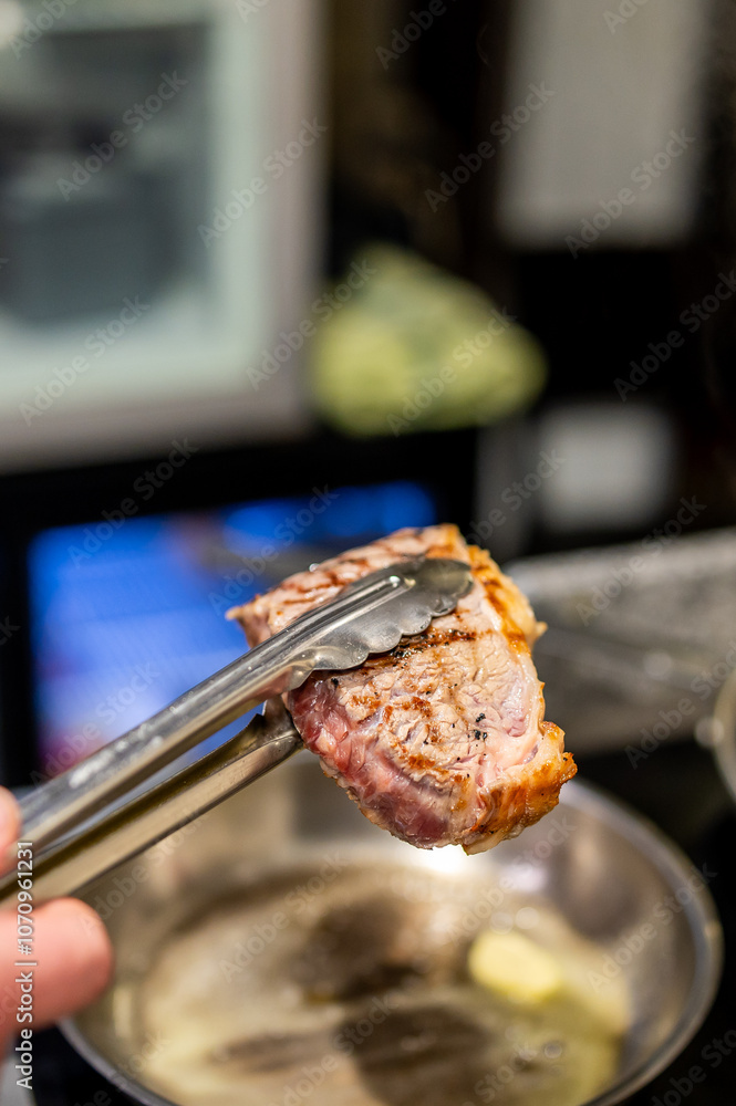 Close-up of a hand using tongs to grill a seasoned steak on a stove, capturing the sizzle and texture of cooking. Perfect for culinary, food preparation, and cooking themes.