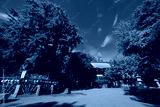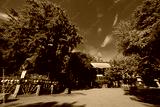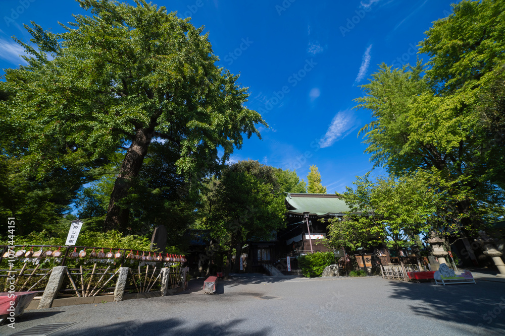 A big sacred tree and temple at Nanasha shrine in Tokyo wide shot