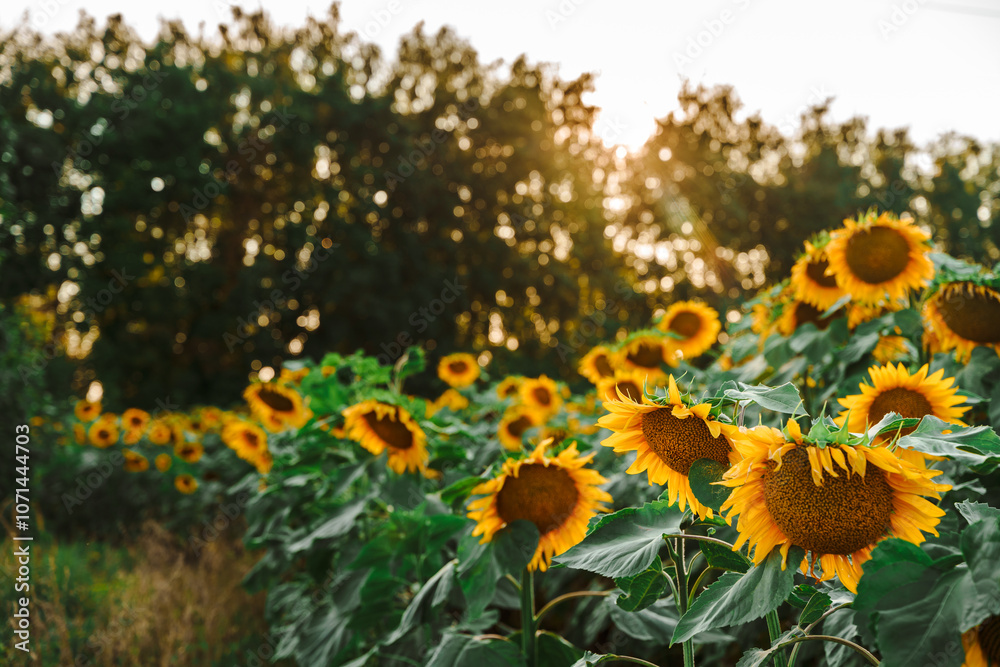 Beautiful landscape on a field of sunflowers, a bright yellow flower