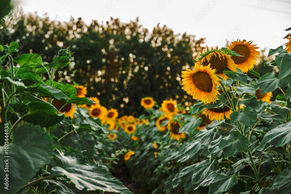 Beautiful landscape on a field of sunflowers, a bright yellow flower