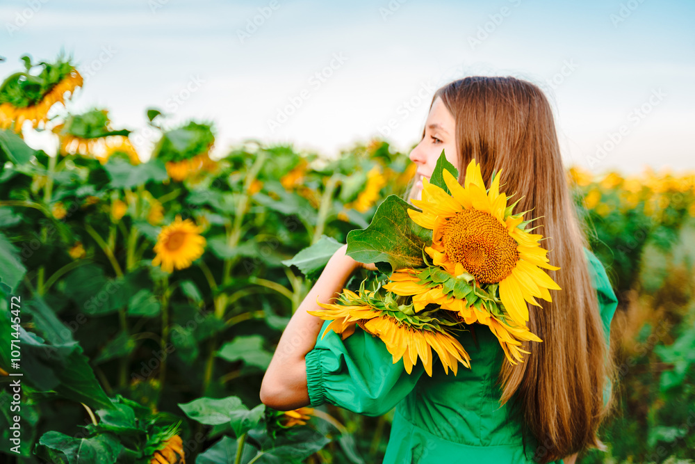 A charming young woman in a dress in a field of sunflowers. A beautiful concept of a summer holiday