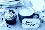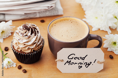 Coffee mug with cupcake, flowers, newspaper and notes good morning on rustic table, sweet dessert for breakfast, lifestyle