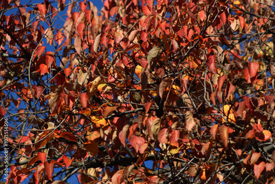 Persimmon tree with Persimmon ripe fruits red and orange leaves on branches. Diospyros kaki on late autumn season