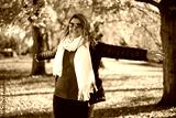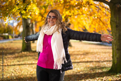 Beautiful happy young woman wearing black trousers, dark jacket, pink sweater, light scarf, glasses walking with arms spread out in city park with deciduous trees on sunny autumn day. Front view
