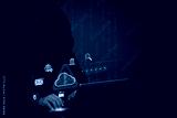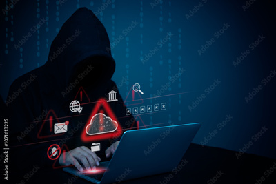 Hooded figure at laptop with cybersecurity alert icons, symbolizing hacking threats, data breaches, and online crime. Ideal for cybersecurity concepts.