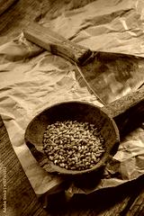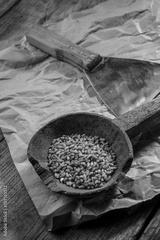 Vecchio mestolo in legno con dentro grano duro con affianco una spatola per tagliare la pasta della pizza su tovaglietta di carta , sopra tavolo in legno