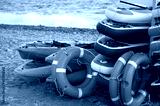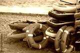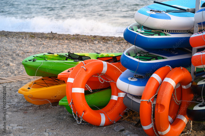 Kayaks and life preservers sit on the beach, ready for a day of water fun