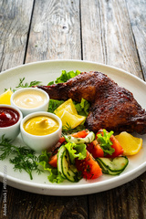 Oven roasted chicken thigh with various dressing and fresh vegetables served on white plate on wooden table