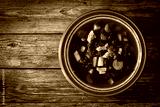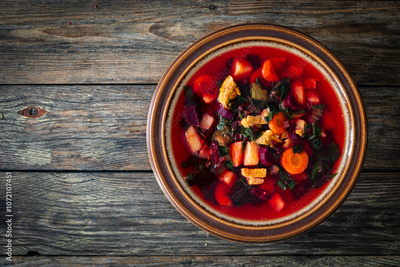 Borsch - beetroot soup served in white bowl on wooden table. Top view