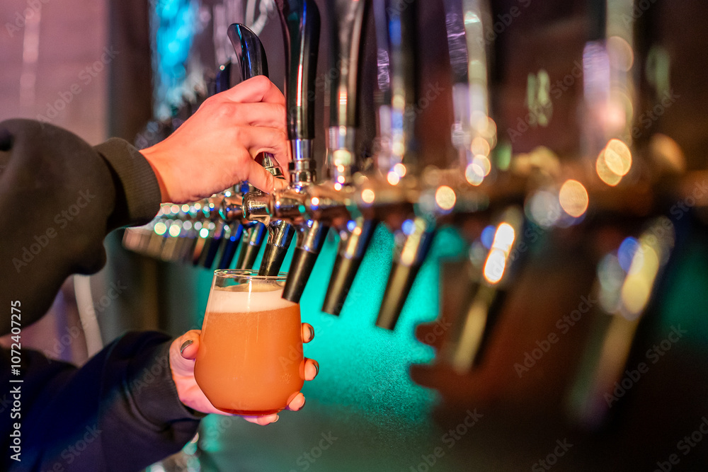 A close-up of a hand pouring beer from a tap into a clear glass at a bar. Multiple taps and a price board are visible in the background, creating a lively and inviting atmosphere