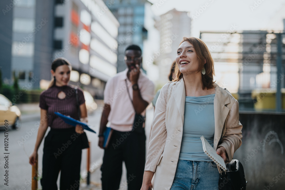A group of multicultural business professionals walking together in an urban city environment, exuding confidence and camaraderie. The image captures the essence of teamwork and diversity in a modern