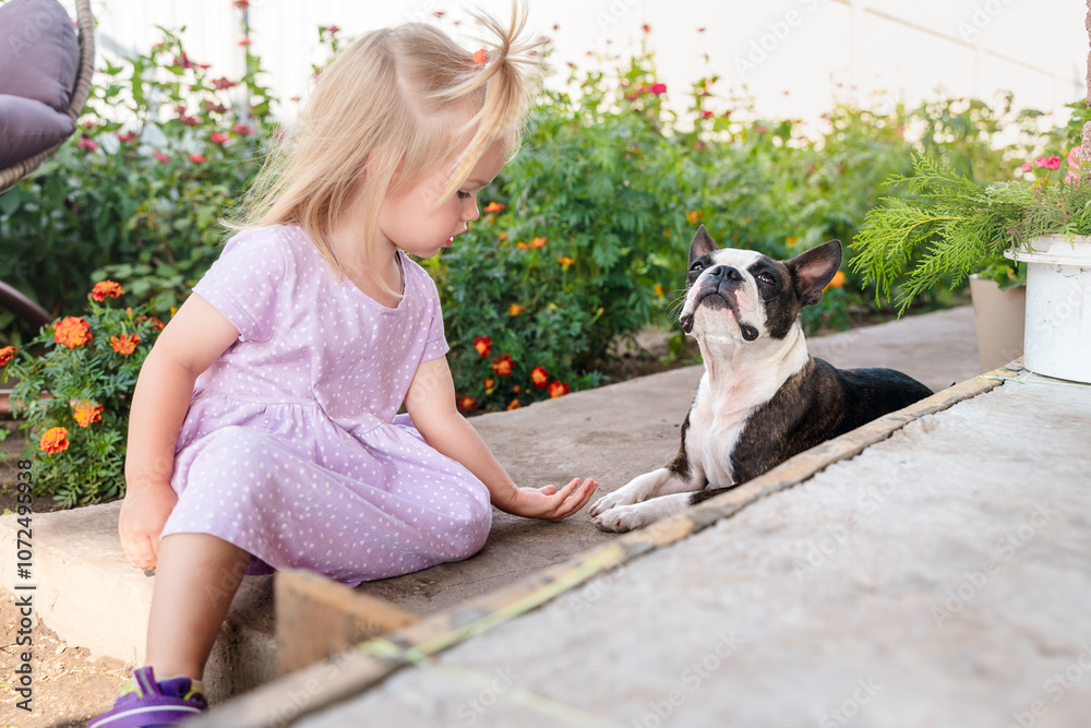 Little child girl petting and hugging a Boston terrier dog outside. A family dog, caring and loving for animals.