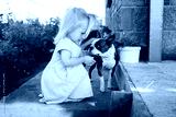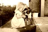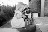 Little child girl petting and hugging a Boston terrier dog outside. A family dog, caring and loving for animals.
