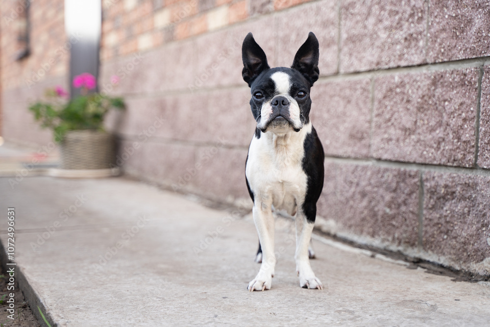 A beautiful portrait of a Boston terrier dog outside.