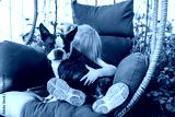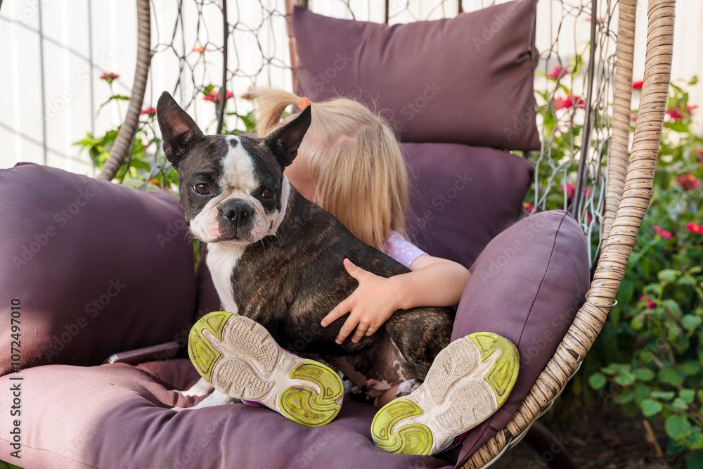 Little child girl petting and hugging a Boston terrier dog outside. A family dog, caring and loving for animals.