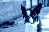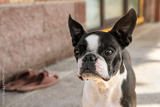 A beautiful portrait of a Boston terrier dog outside.