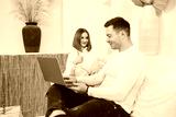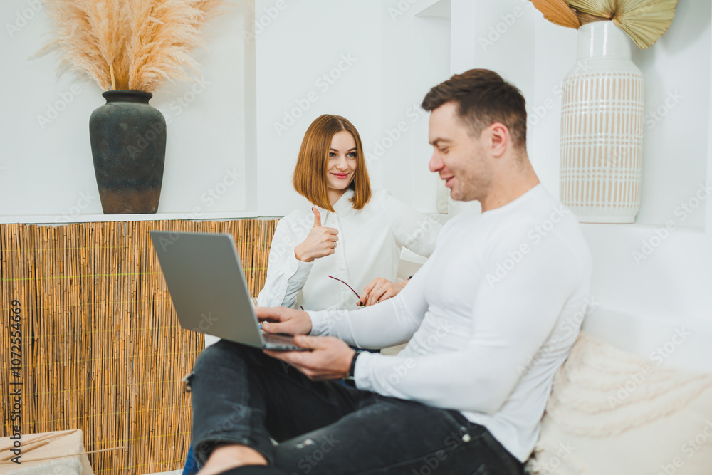 A man and a woman are sitting on a sofa and watching a movie on a laptop. Young couple working remotely on laptop at home.