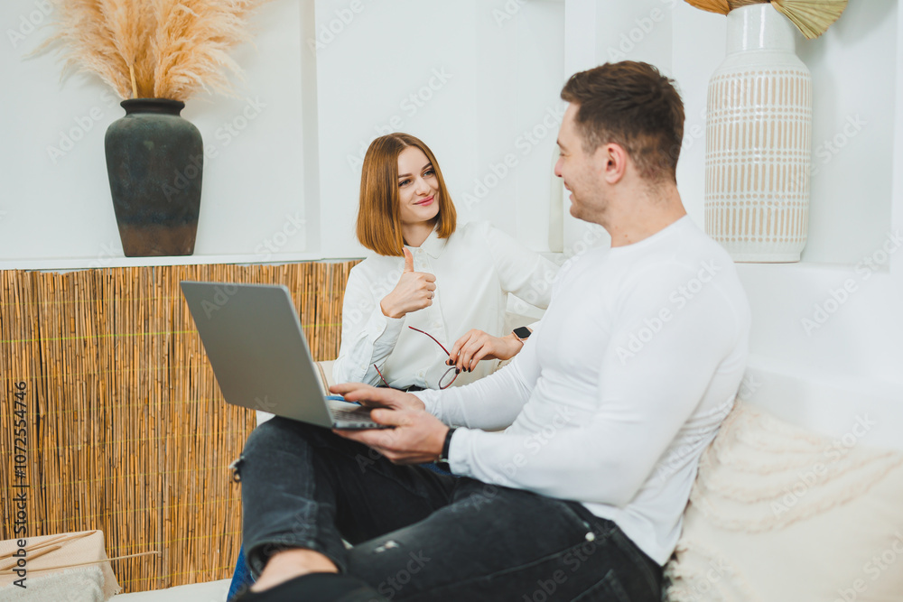 A man and a woman are sitting on a sofa and watching a movie on a laptop. Young couple working remotely on laptop at home.