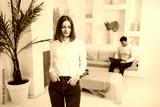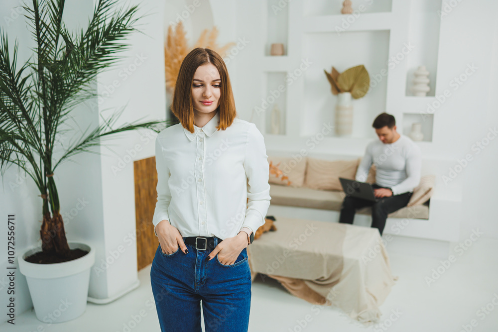 A cute woman is standing in a bright room at home. Woman in casual clothes relaxing at home.