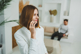 A young pretty woman in a white shirt is talking on the phone and working online. A woman works remotely in a bright room at home.