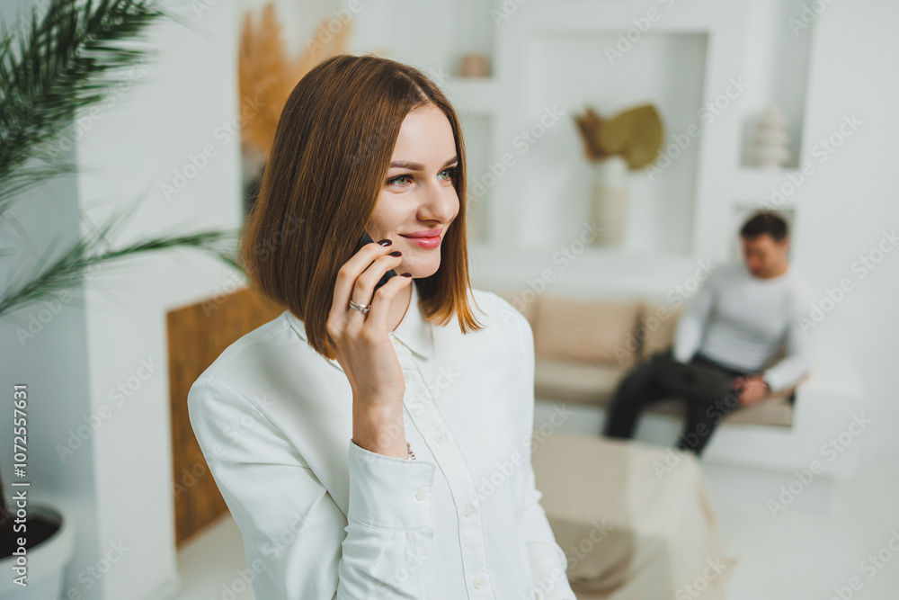 A young pretty woman in a white shirt is talking on the phone and working online. A woman works remotely in a bright room at home.