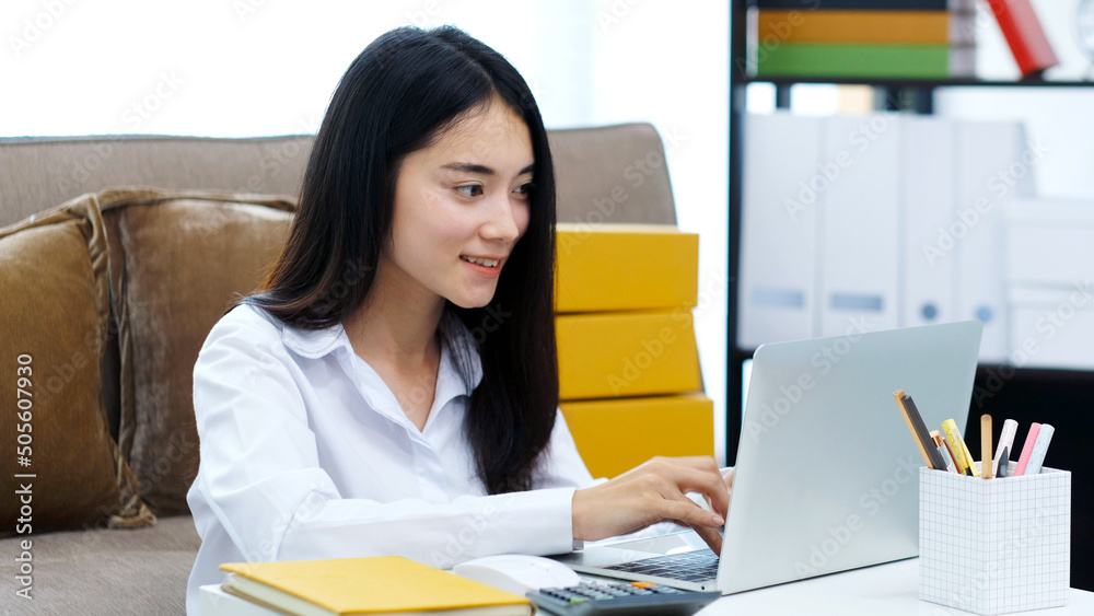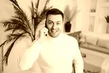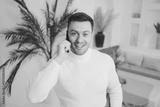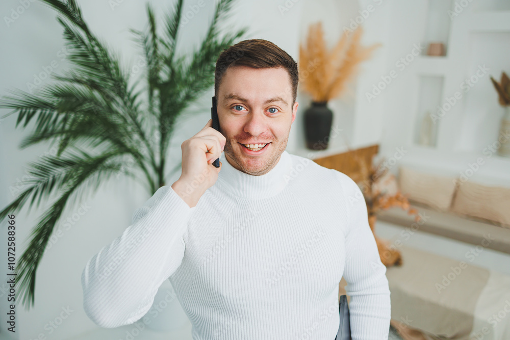 A man in a white sweater is talking on the phone at home. Male freelancer works online remotely.